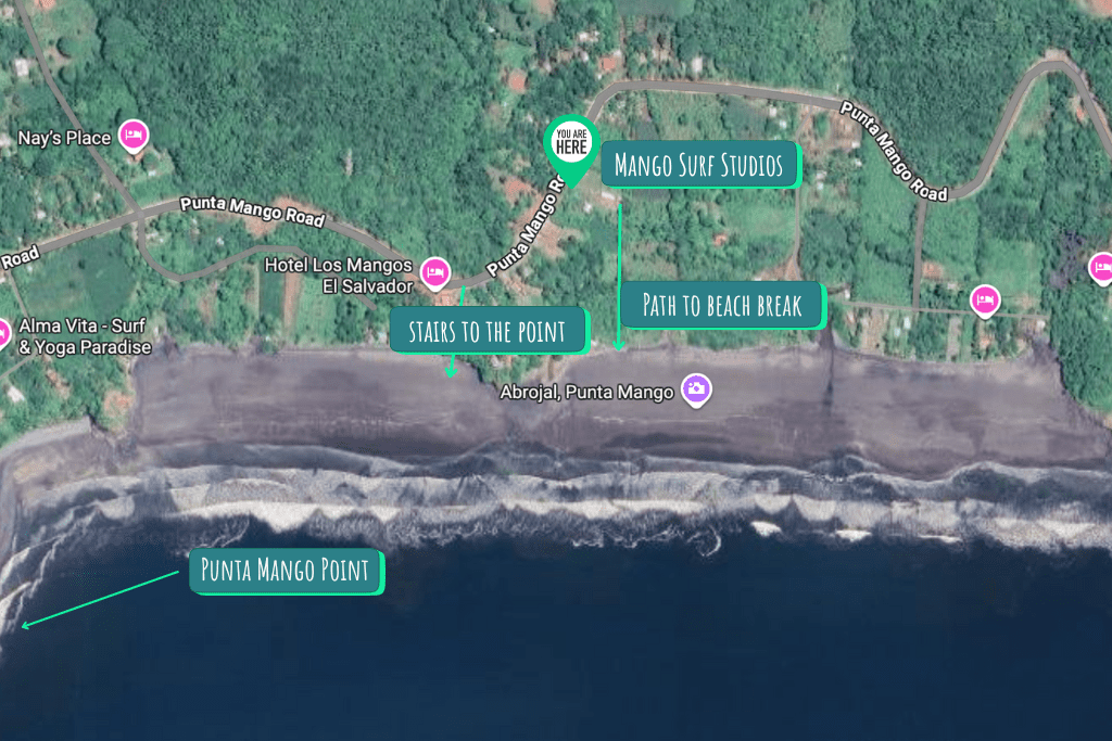 200 meter path from Mango Surf Studios to the beach break and just one beach behin the paddle out spot to Punta Mango Point. Easily accessible from the stairs up the road.
